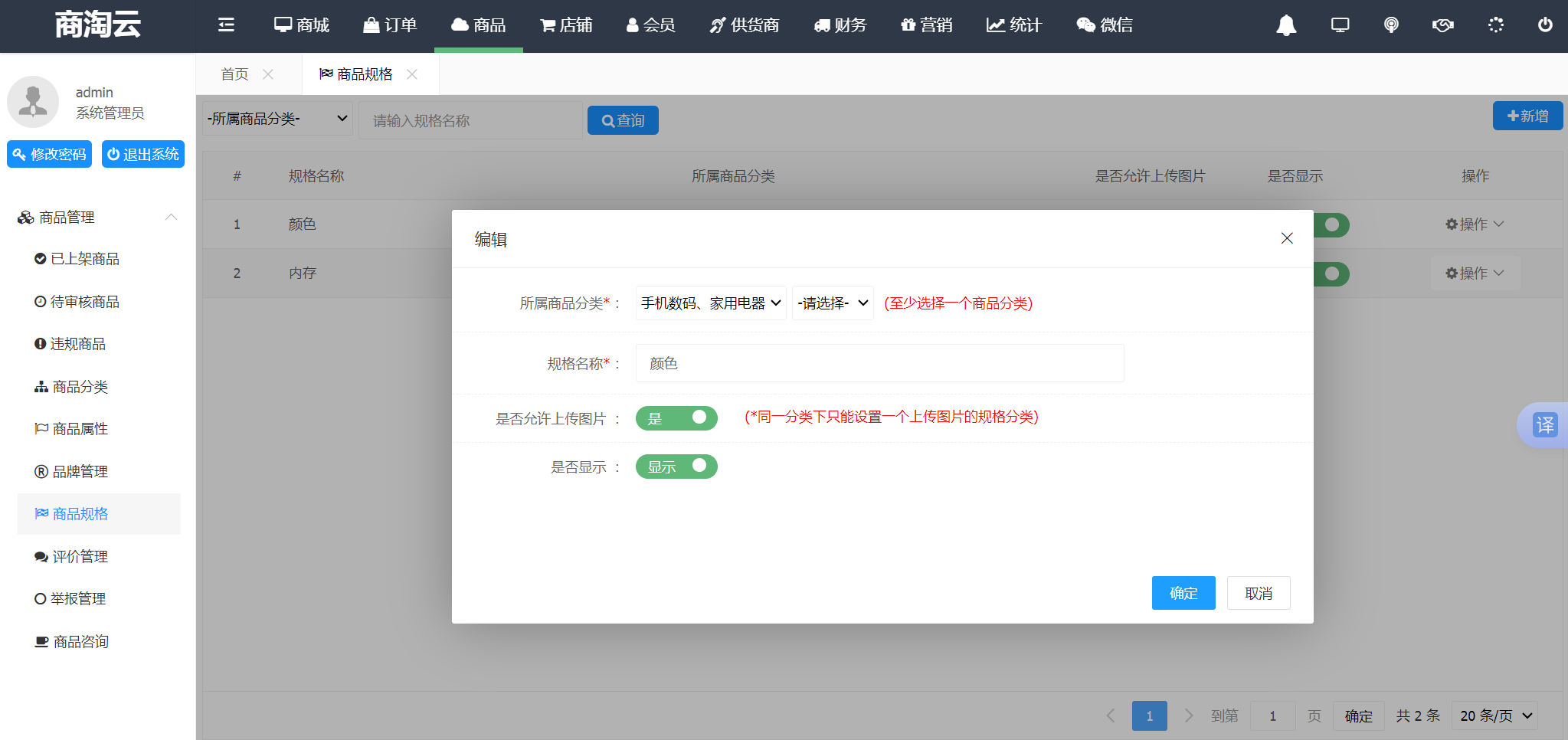 商品规格主要用于管理商品的规格,一个分类下可以设置一个规格允许上传图片: