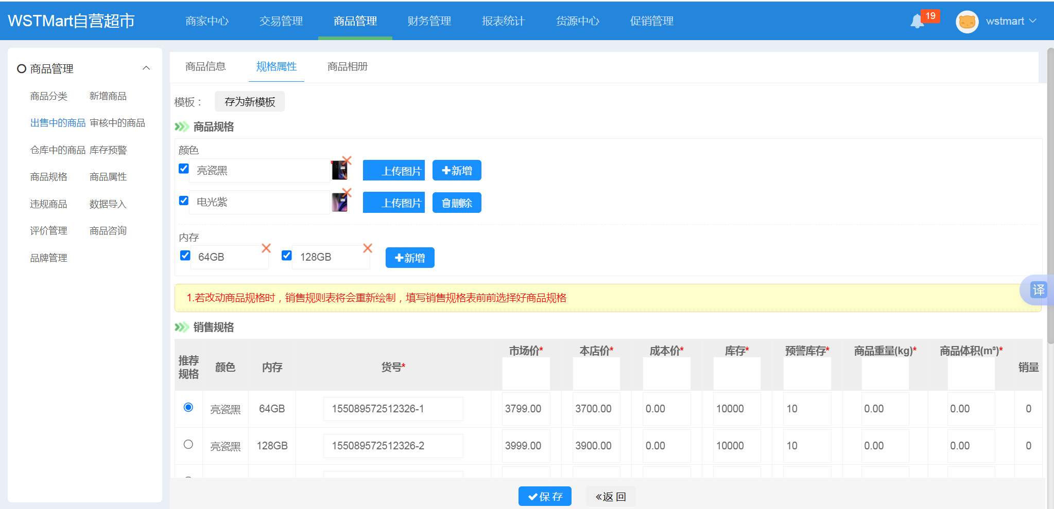 b2b2c商城系统商品规格设置