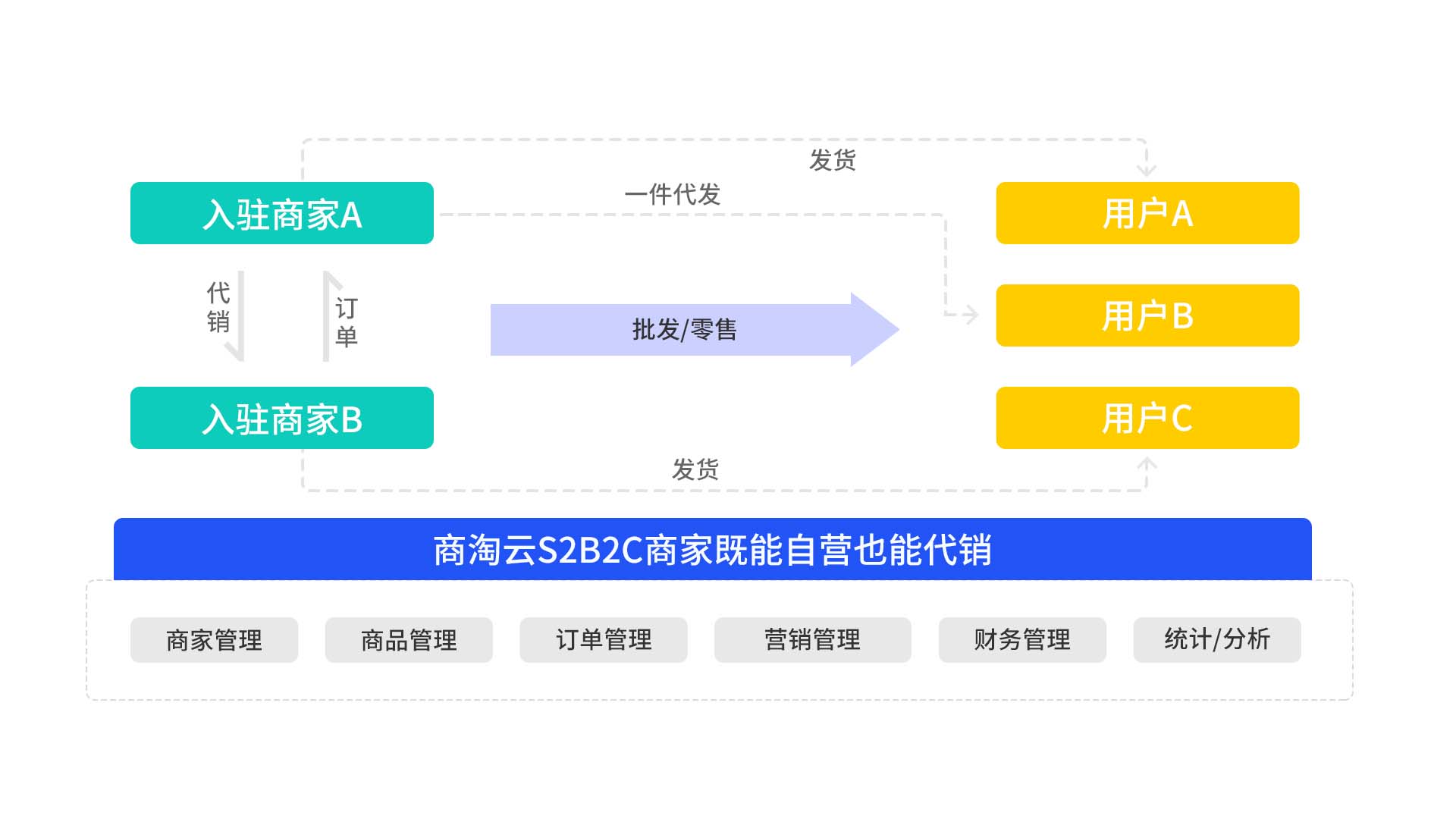 商淘云的供货模式不仅帮助商家减少了渠道拓展的难度,也避免了库存积压的风险。商家只需专注于产品质量和生产,而销售和物流环节则由平台负责,使其能够专注于业务扩展,获得稳定的收入来源。
